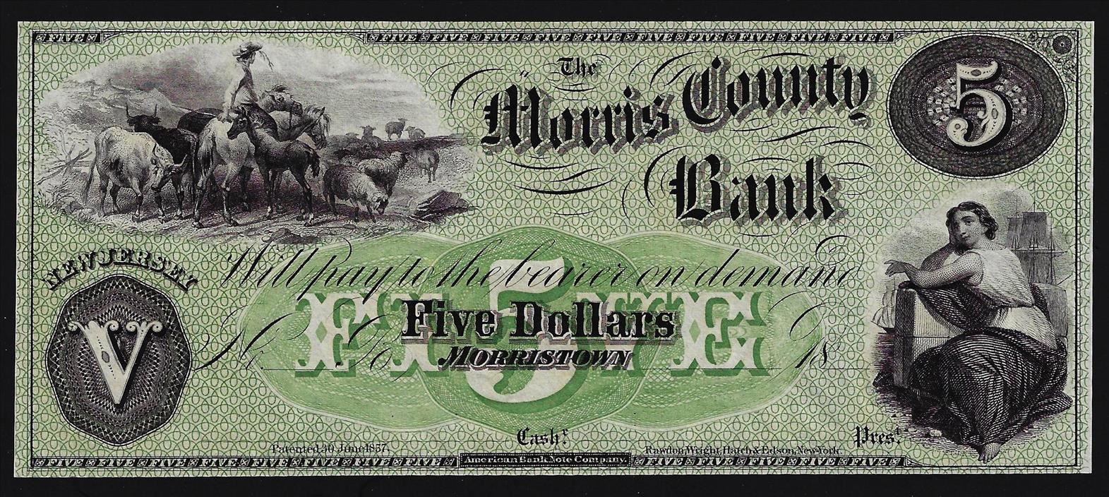 One 1800s $5 The Morris County Bank Obsolete Note.