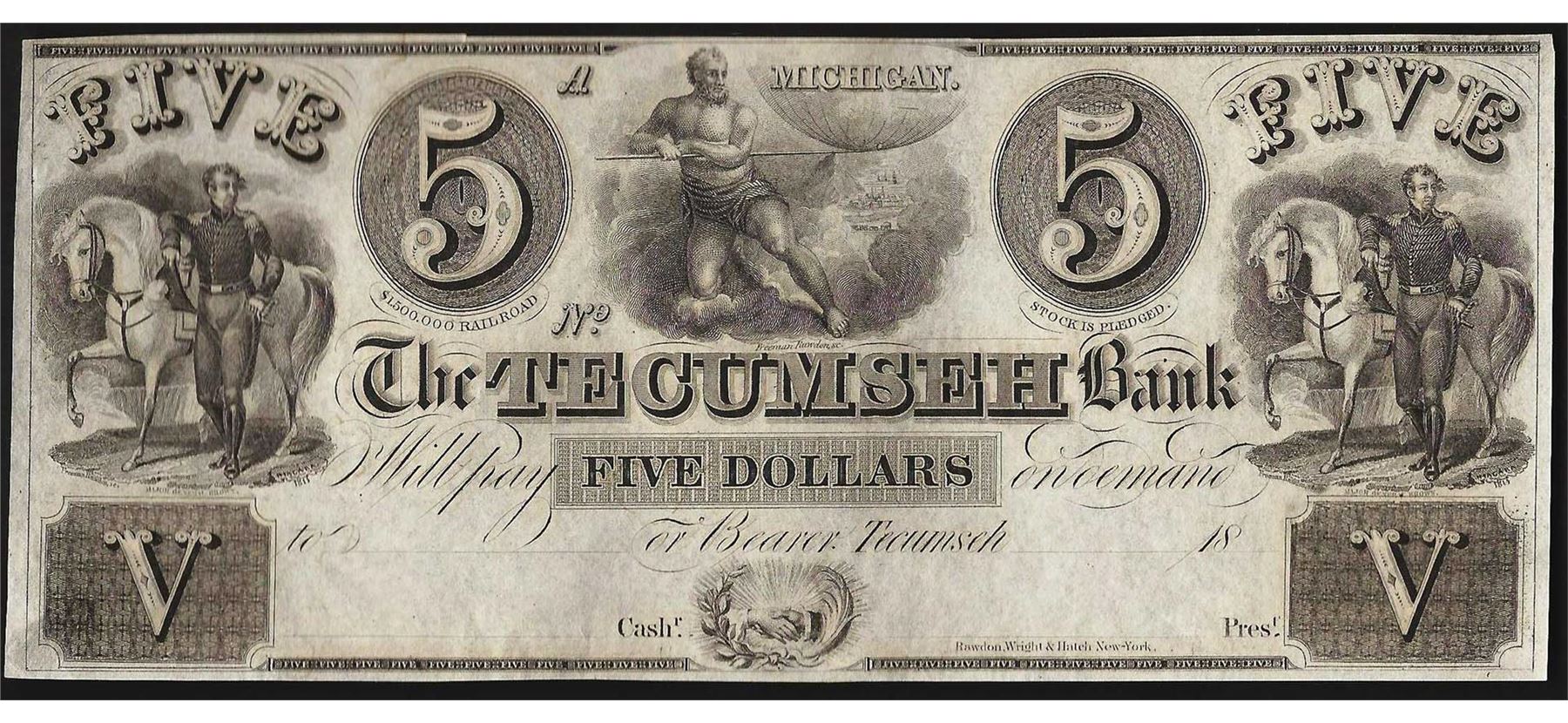 One 1800s $5 The Tecumseh Bank Obsolete Bank Note.