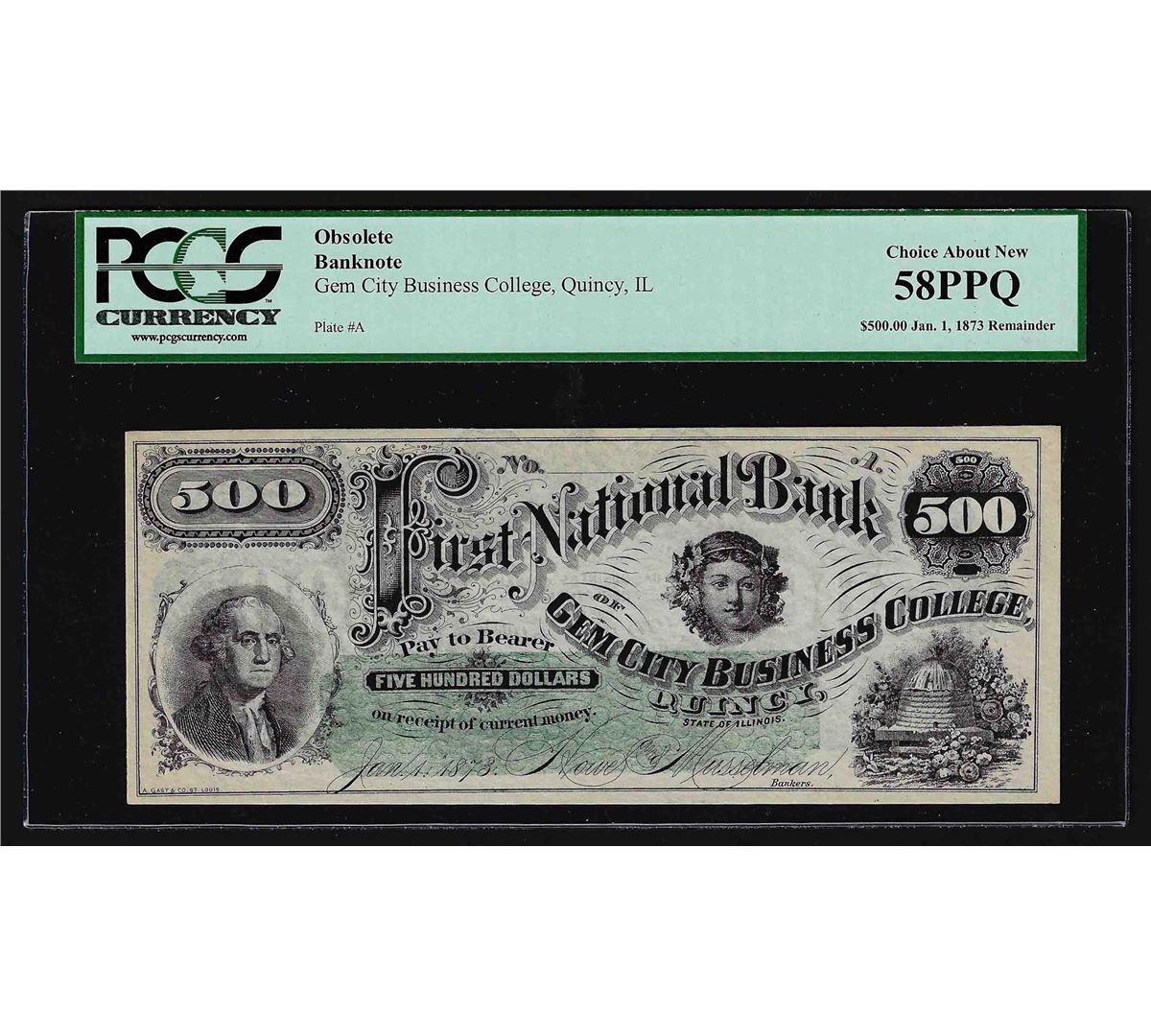 One 1800s $500 First National Bank of Gem City Business College Obsolete Note PCGS 58PPQ. PCGS Graded.