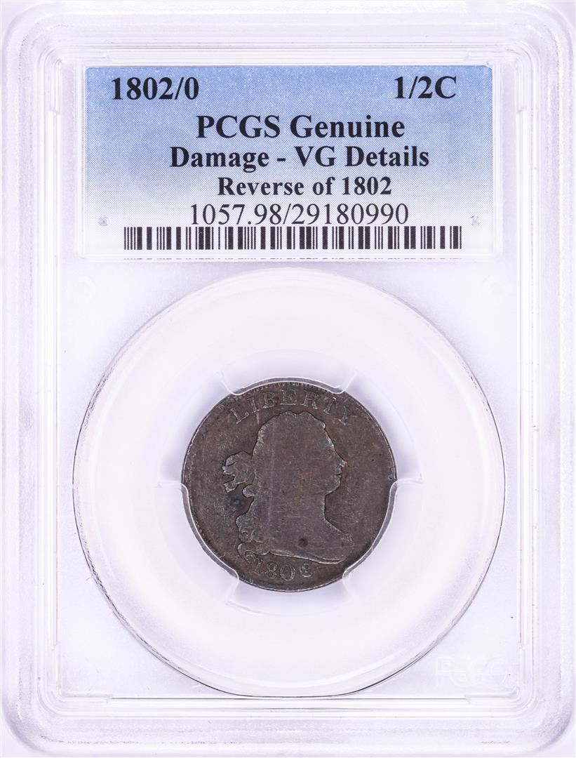 One 1802/0 Reverse of 1802 Draped Bust Half Cent Coin PCGS VG Detail. PCGS Graded.