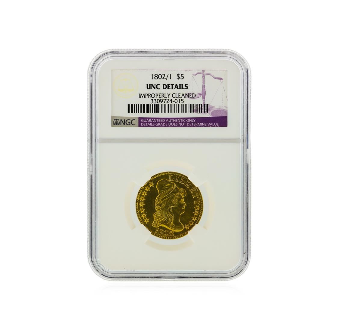 One 1802/1 $5 Heraldic Eagle Reverse Gold Coin, NGC Graded UNC Details Improperly Cleaned Gold Coin. NGC Certified.