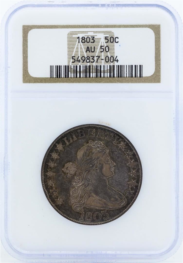 One 1803 Draped Bust Silver Half Dollar Coin NGC AU50. NGC Certified.