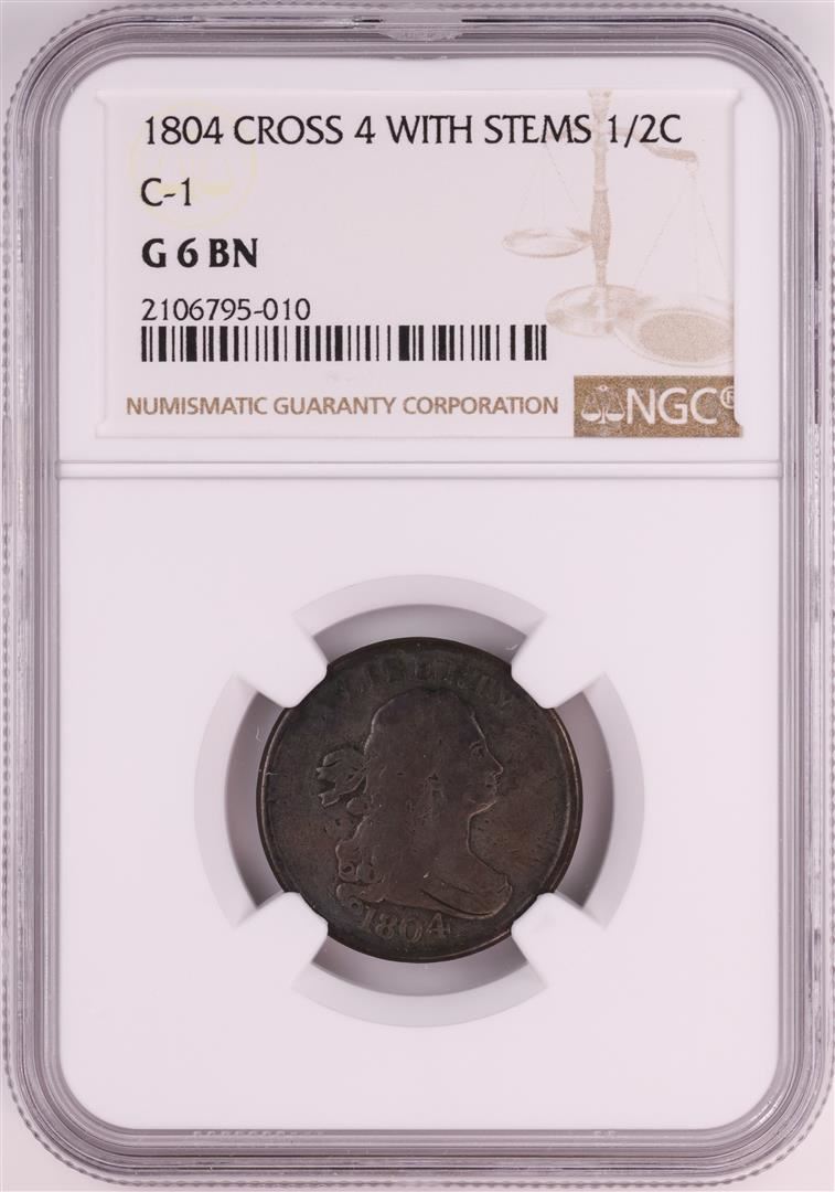 One 1804 Crosslet 4 Stems C-1 Draped Bust Half Cent Coin NGC G6 BN. NGC Certified.