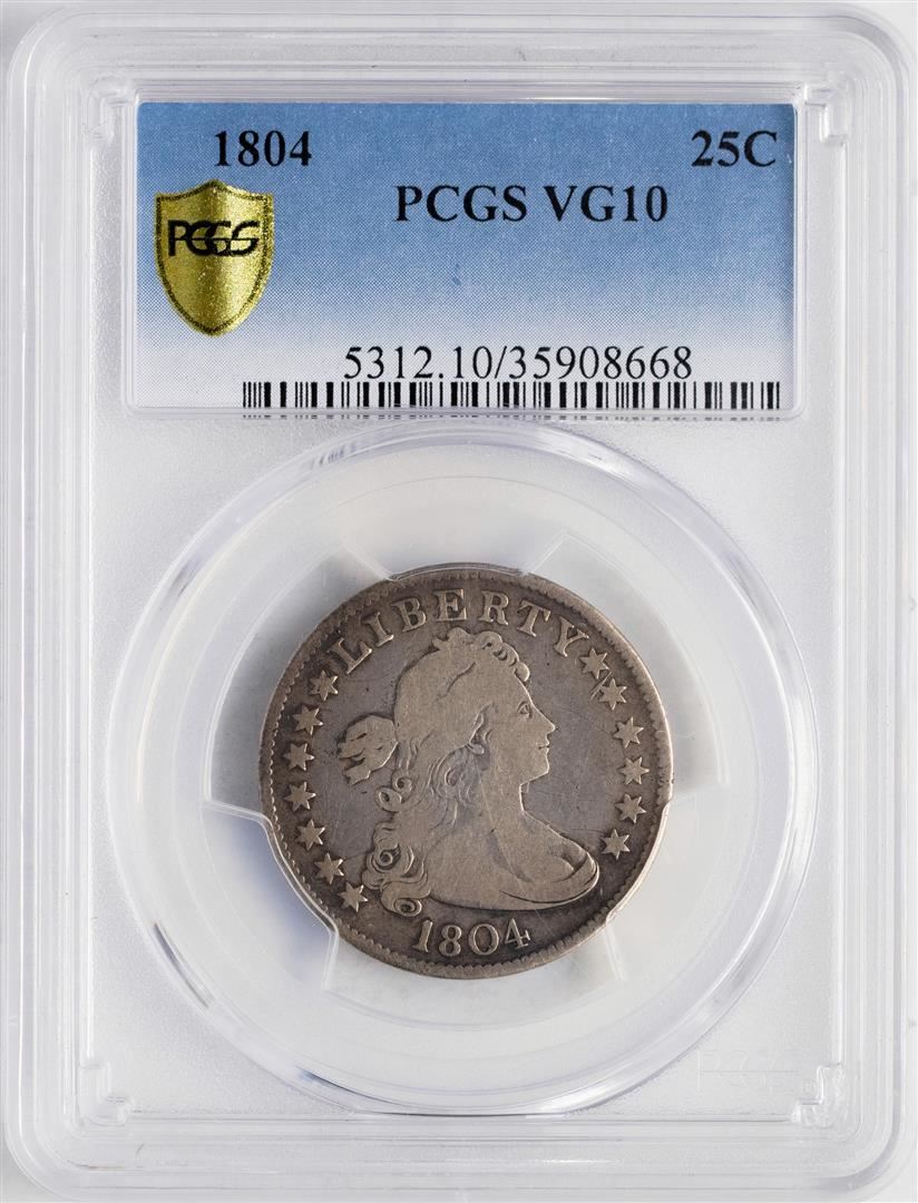 One 1804 Flowing Hair Quarter Dollar Coin PCGS VG10. PCGS Graded.