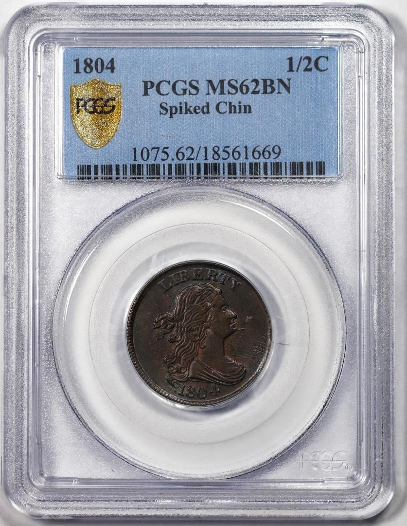 One 1804 Spiked Chin Draped Bust Half Cent Coin PCGS MS62BN. PCGS Graded.