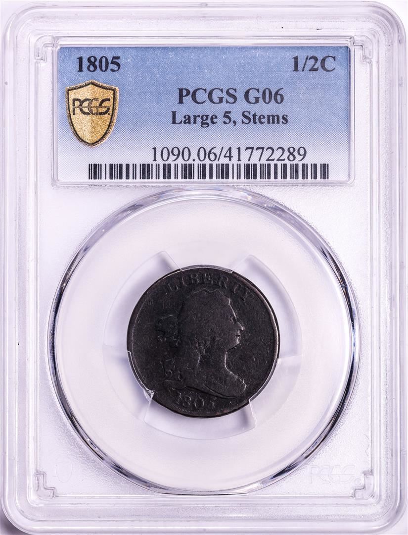 One 1805 Large 5, Stems Draped Bust Half Cent Coin PCGS G06. PCGS Graded.