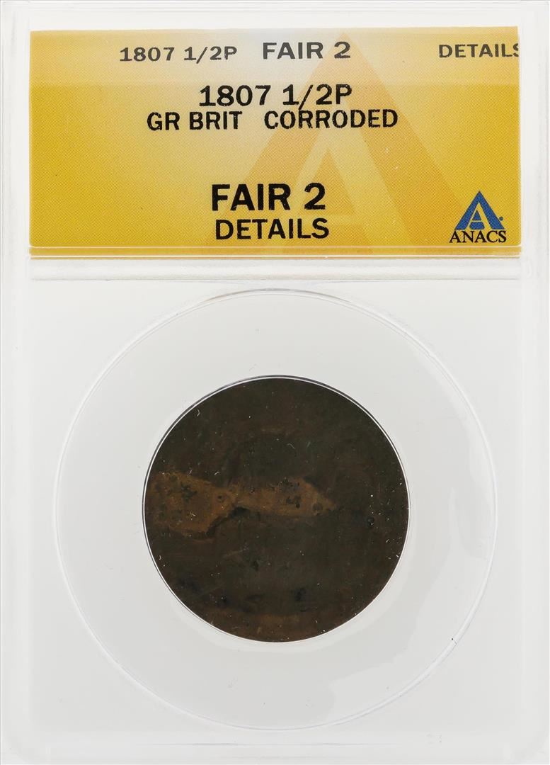 One 1807 1/2 Penny Great Britain Corroded Coin ANACS Fair 2 Details. ANACS Certified.