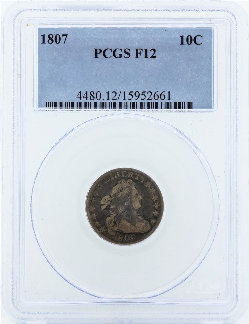 One 1807 Draped Bust Dime Coin PCGS F12. PCGS Graded.