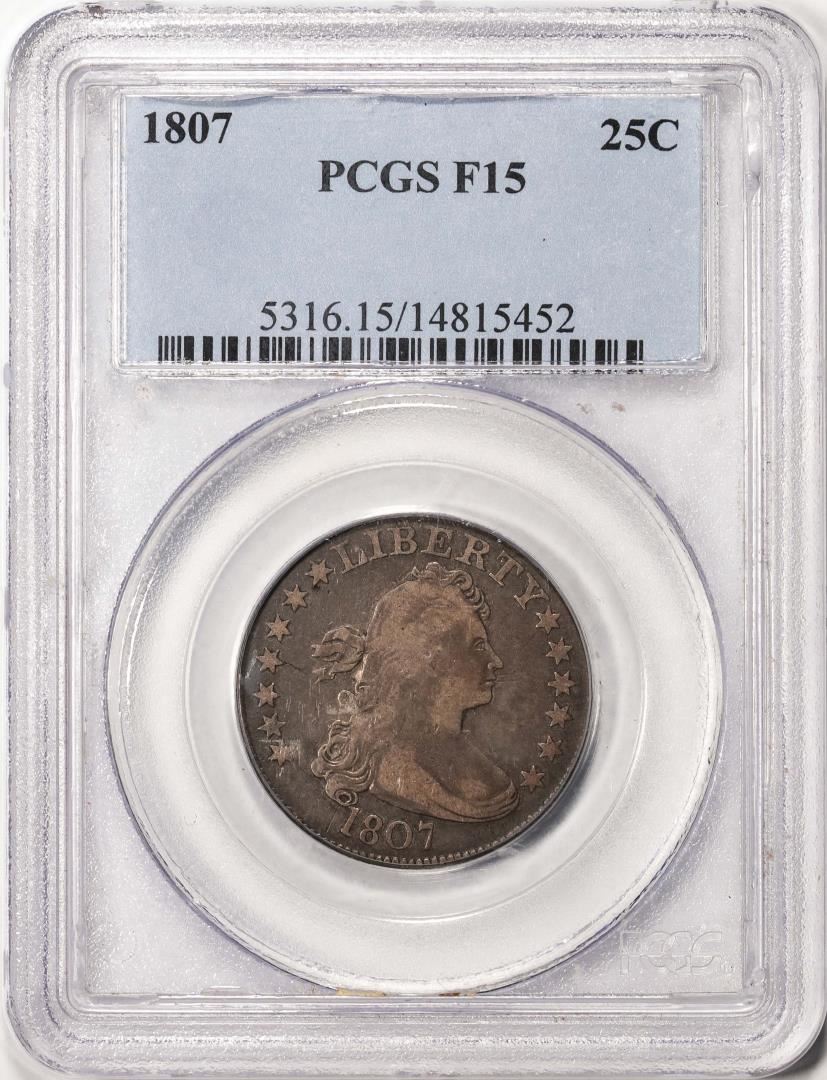 One 1807 Draped Bust Quarter Coin PCGS F15. PCGS Graded.