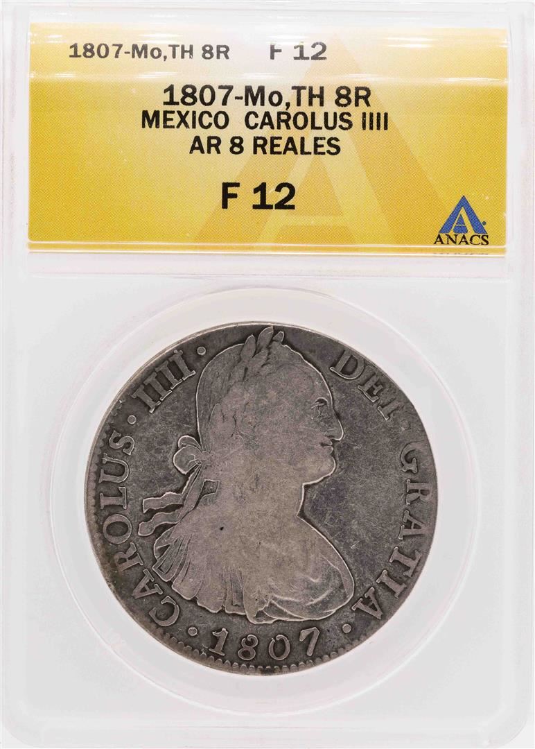 One 1807-Mo TH Mexico Carolus IV AR 8 Reales Silver Coin ANACS F12. ANACS Certified.