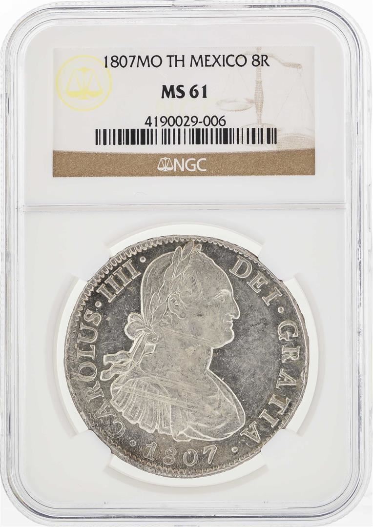 One 1807MO TH Mexico 8 Reales Silver Coin NGC MS61. NGC Certified.