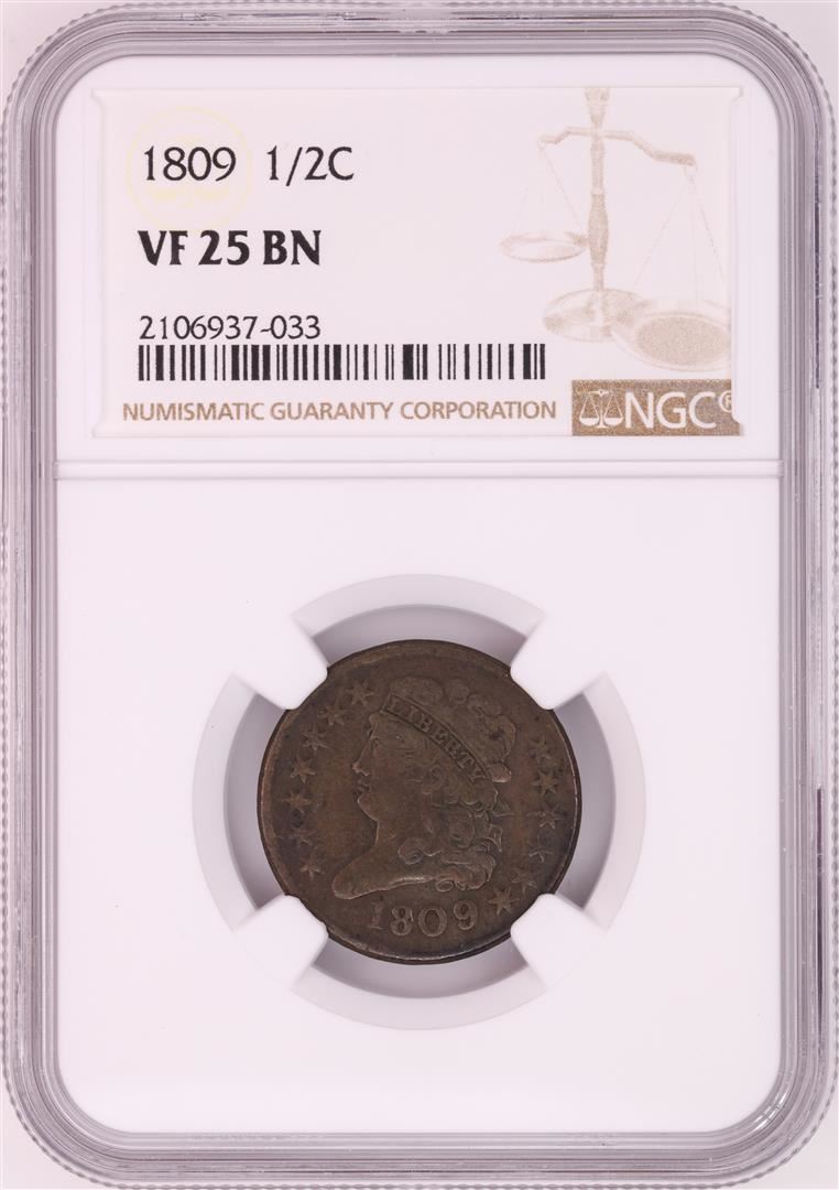 One 1809 Classic Head Half Cent Coin NGC VF25BN. NGC Certified.