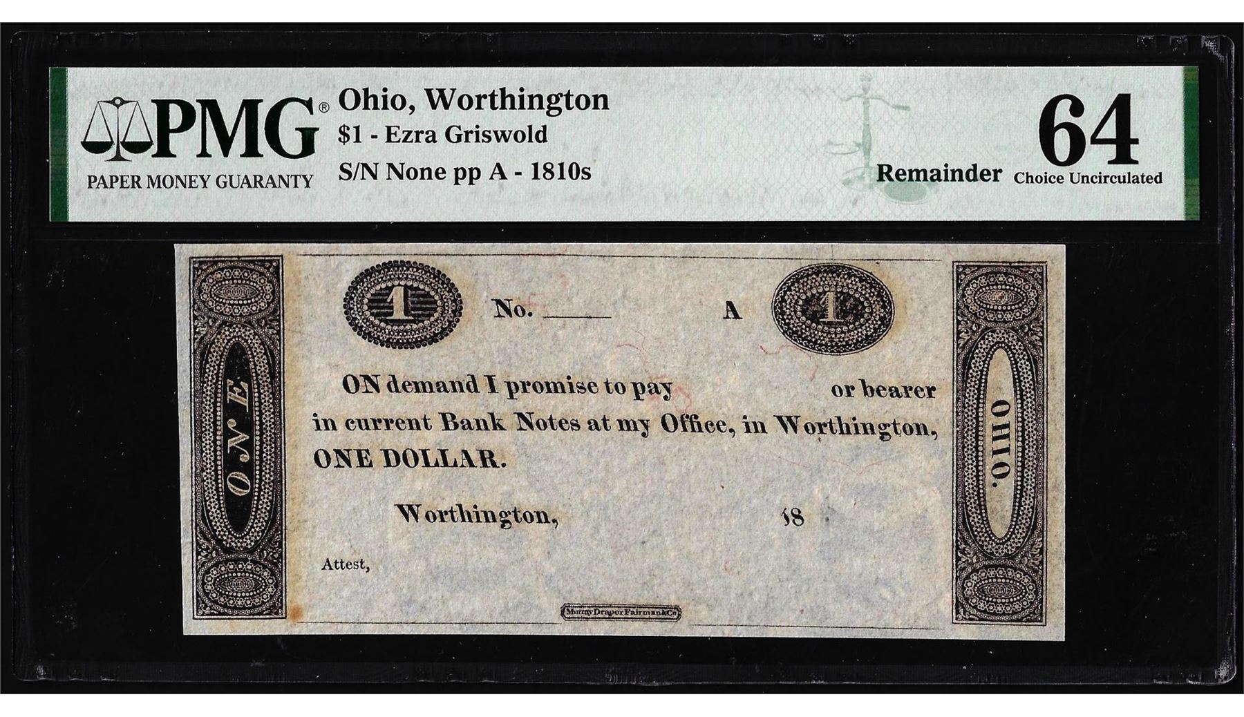 One 1810's $1 Ezra Griswold Remainder Obsolete Note PMG Choice Uncirculated 64. PMG Certified.