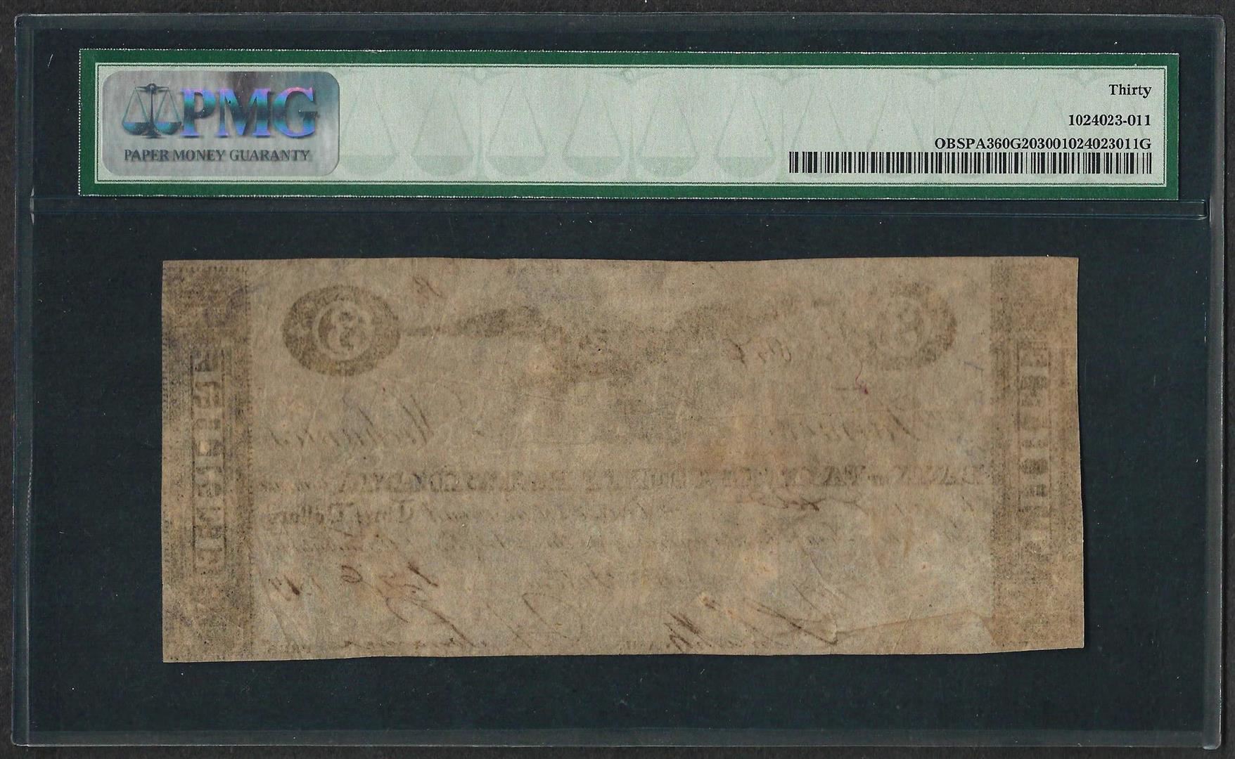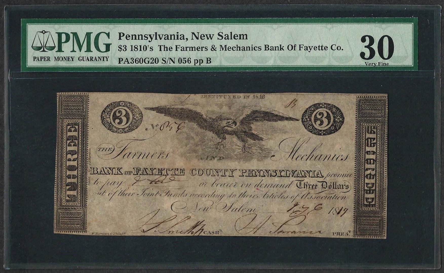 One 1810's $3 Farmers & Mechanics Bank of Fayette Co. Obsolete Note PMG Very Fine 30. PMG Certified.