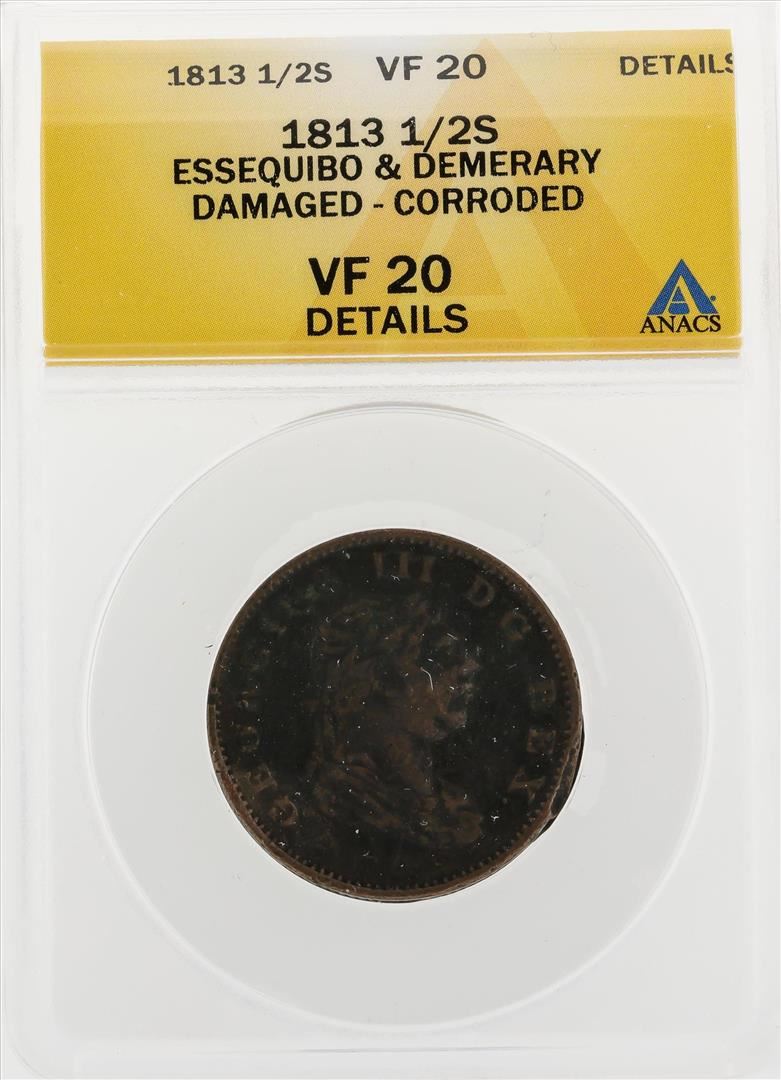 One 1813 1/2 Stiver Essequibo and Demerary Damaged Corroded Coin ANACS VF20 Details. ANACS Certified.