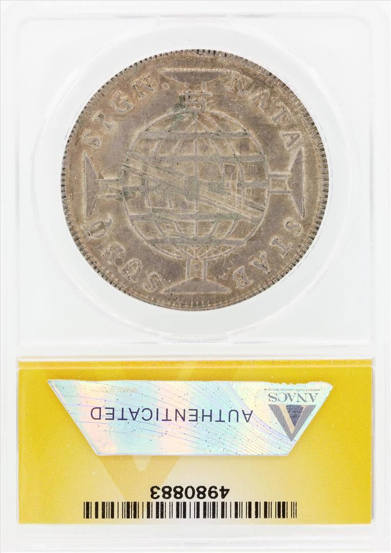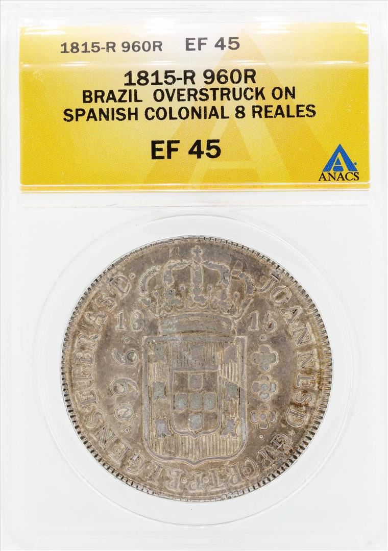 One 1815-960R Brazil Overatruck on Spanish Colonial 8 Reales Coin EF45. ANACS Certified.