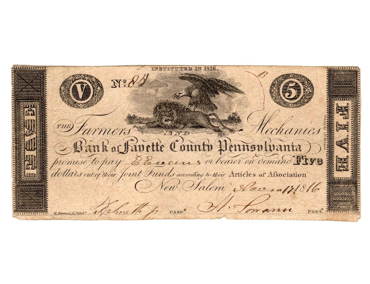 One 1816 $5 The Farmers and Mechanics Bank Pennsylvania Note.