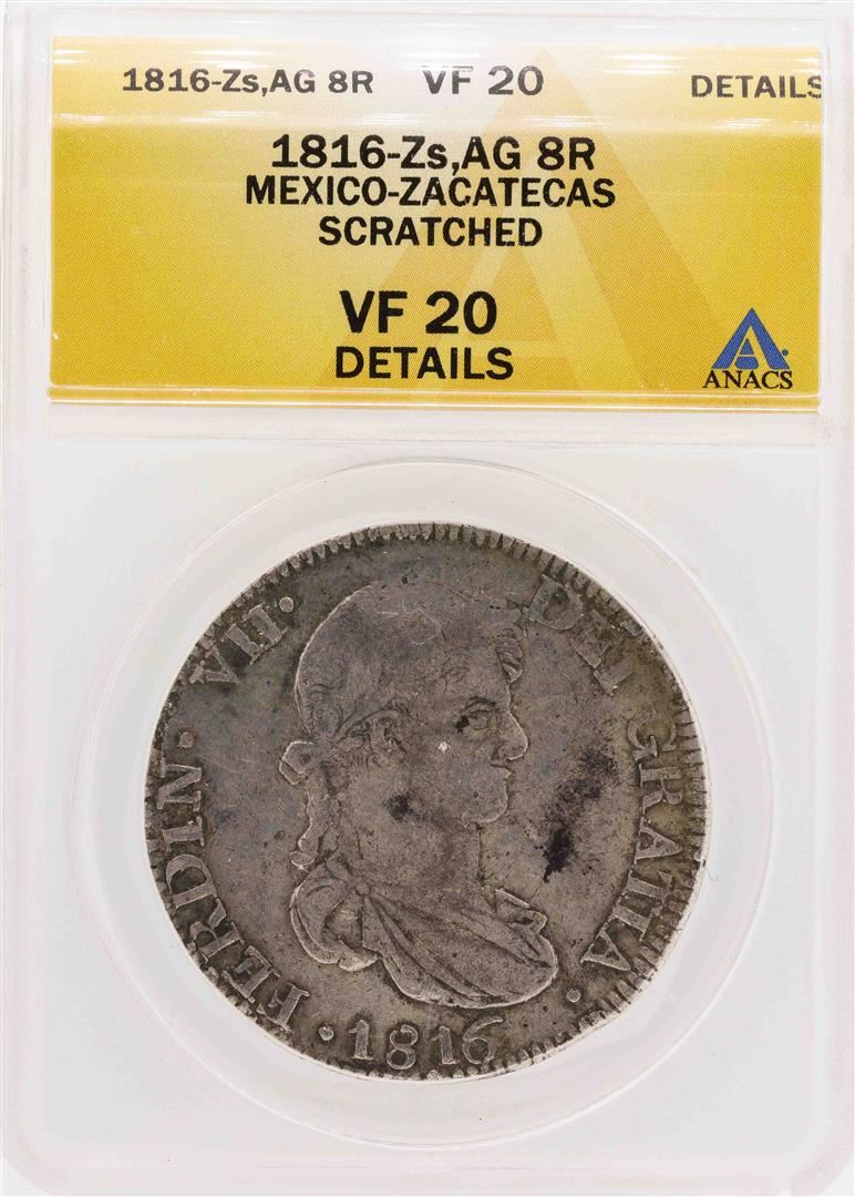 One 1816-ZS AG Mexico-Zacatecas 8 Reales Coin ANACS VF20 Details . ANACS Certified.