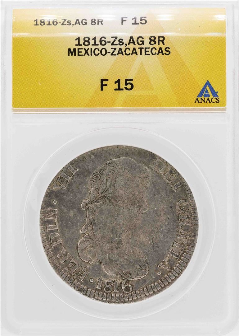 One 1816-Zs AG Mexico-Zacatecas 8 Reales Silver Coin ANACS F15. ANACS Certified.