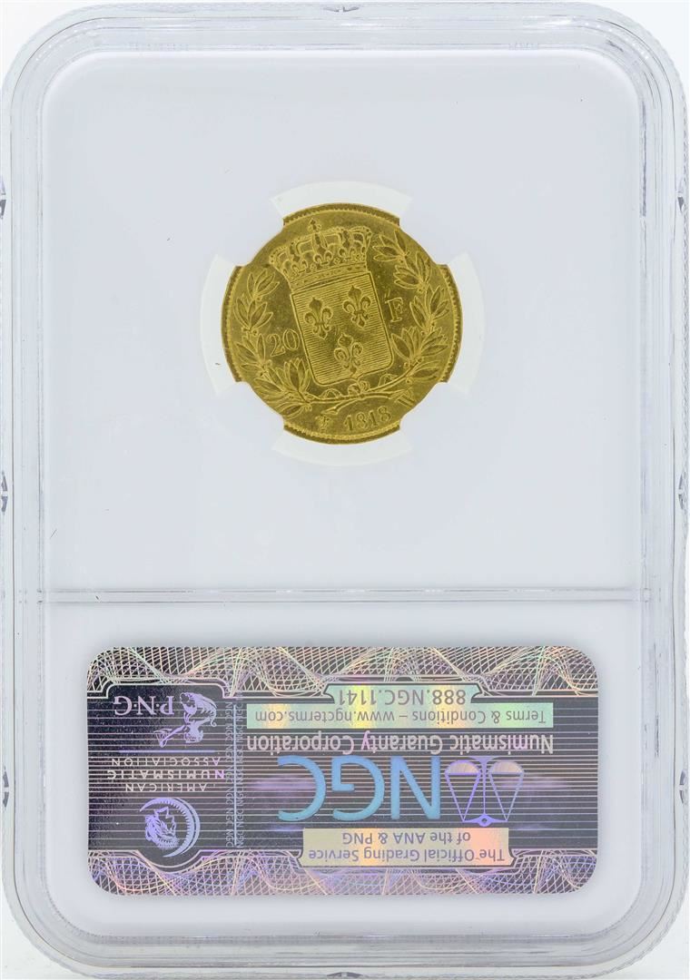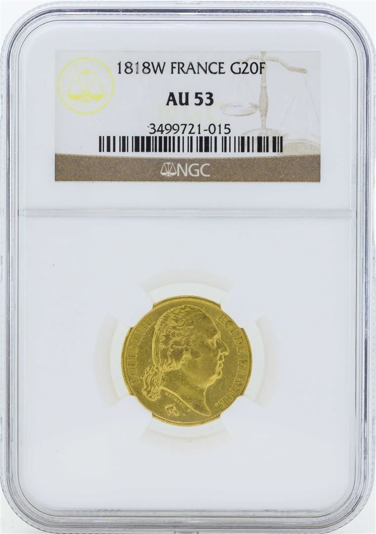 One 1818W France 20 Francs Gold Coin NGC AU53. NGC Certified.