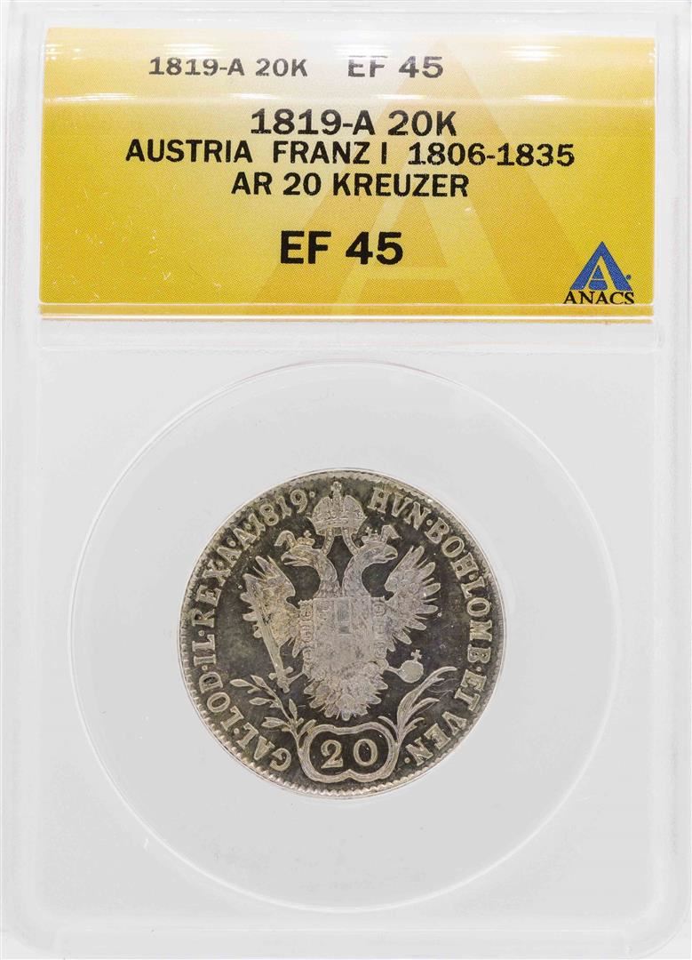 One 1819-A Austria Franz I 20 Kreuzer Silver Coin ANACS XF45. ANACS Certified.