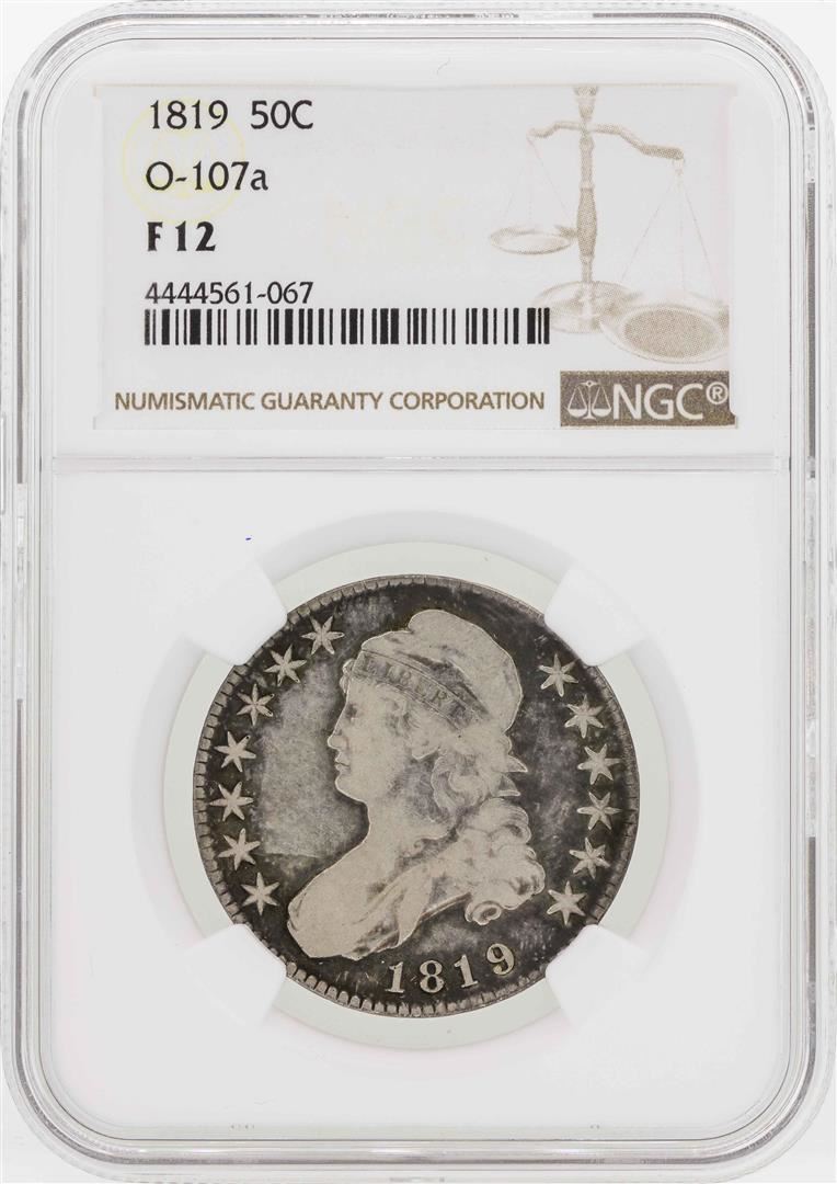 One 1819 Bust Half Dollar Coin O-107a NGC F12. NGC Certified.