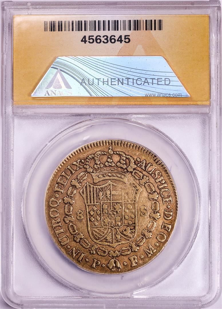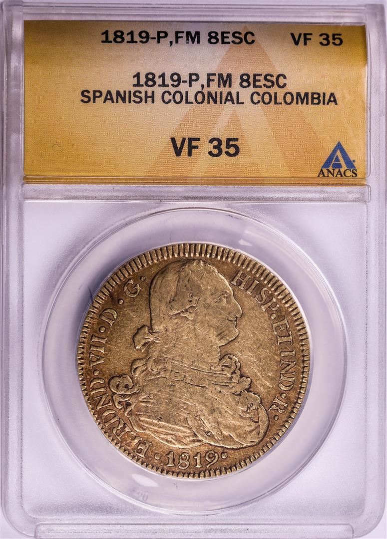 One 1819-P FM Colombia 8 Escudos Ferdinand VII Spanish Colonial Gold Coin ANACS VF35. ANACS Certified.