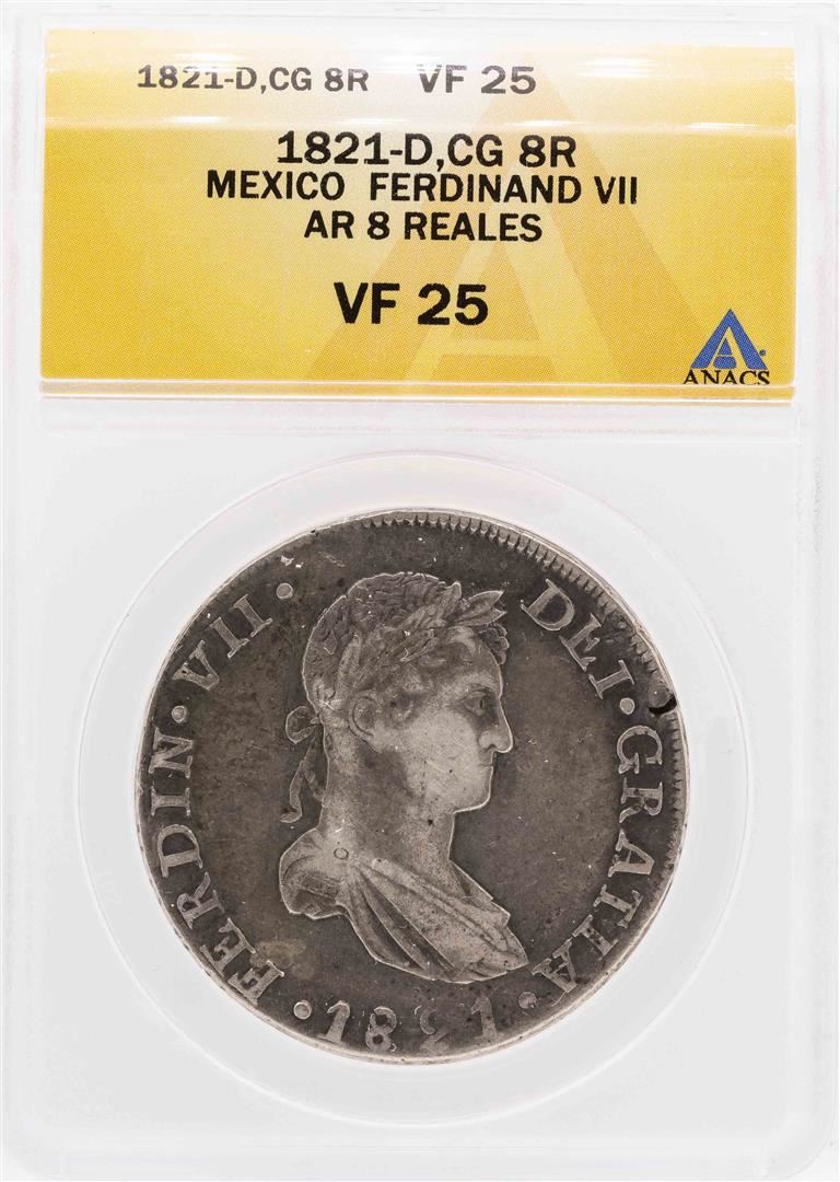 One 1821-D CG Mexico Ferdinand VII AR 8 Reales Coin ANACS VF25. ANACS Certified.