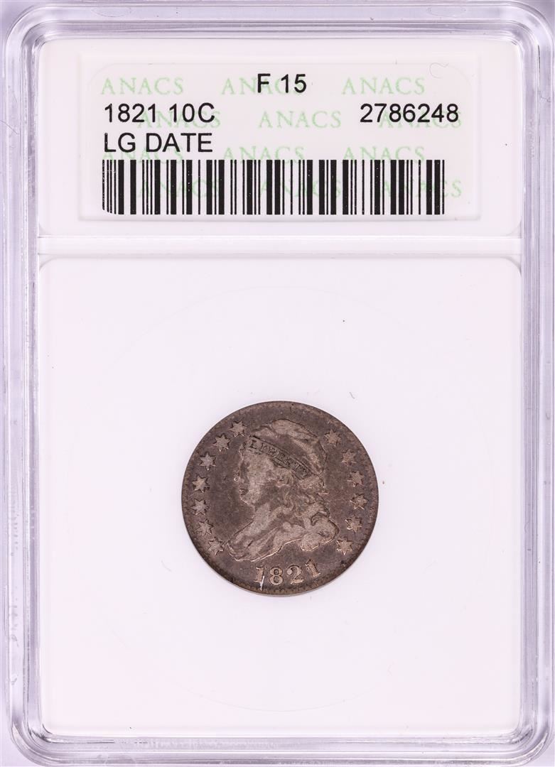 One 1821 Large Date Capped Bust Dime Coin ANACS F15. ANACS Certified.