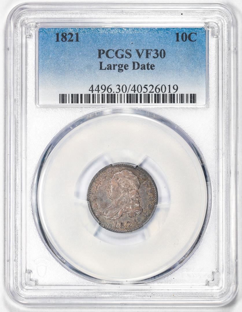 One 1821 Large Date Capped Bust Dime Coin PCGS VF30. PCGS Graded.