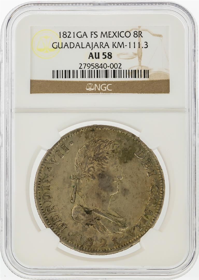 One 1821GA 8 Reales FS Mexico Guadalajara KM-111.3 Coin NGC AU58. NGC Certified.