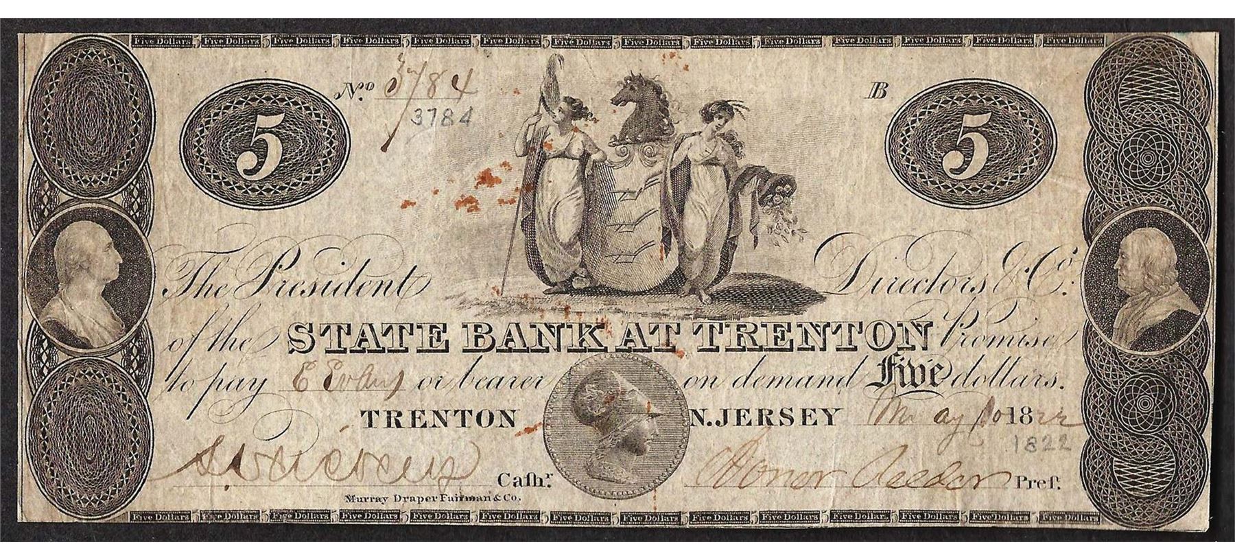 One 1822 $5 The State Bank at Trenton Obsolete Note.