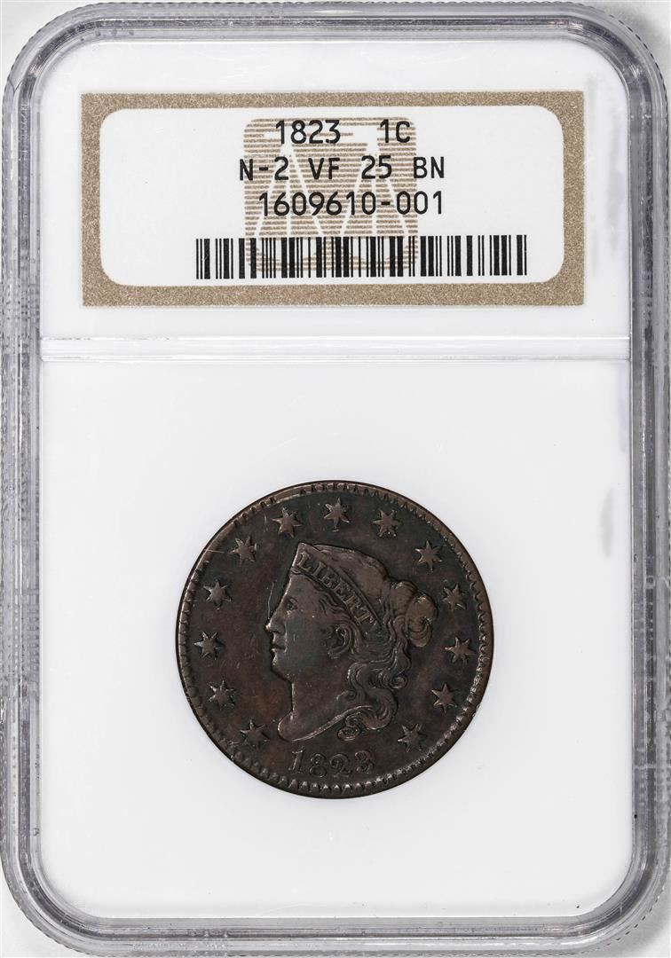 One 1823 N-2 Coronet Head Large Cent Coin NGC VF25 BN. NGC Certified.