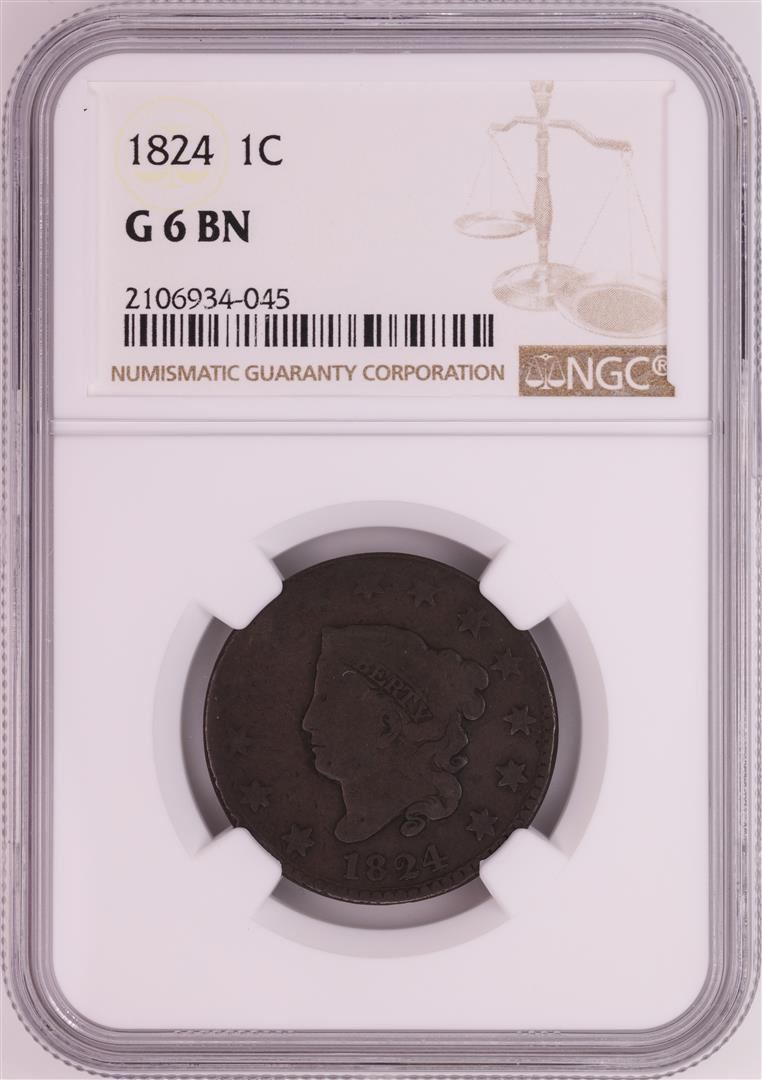 One 1824 Coronet Head Large Cent Coin NGC G6BN. NGC Certified.