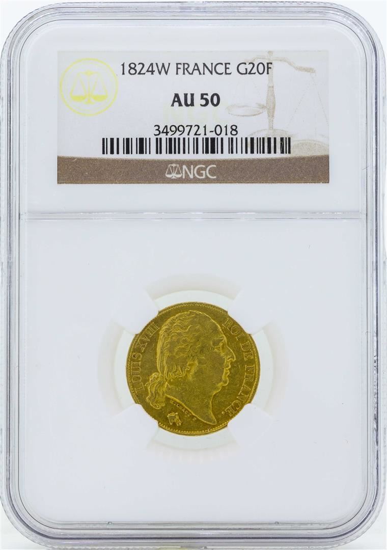 One 1824W France 20 Francs Gold Coin NGC AU50. NGC Certified.