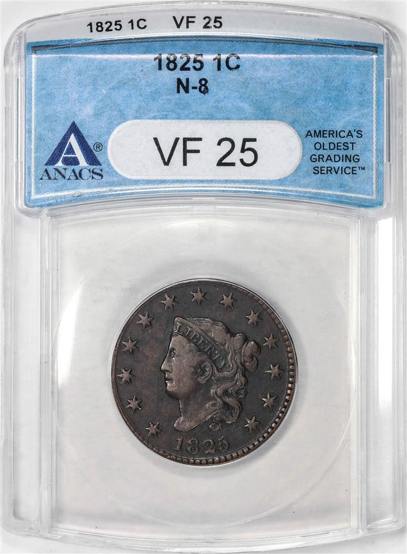 One 1825 N-8 Coronet Head Large Cent Coin ANACS VF25. ANACS Certified.