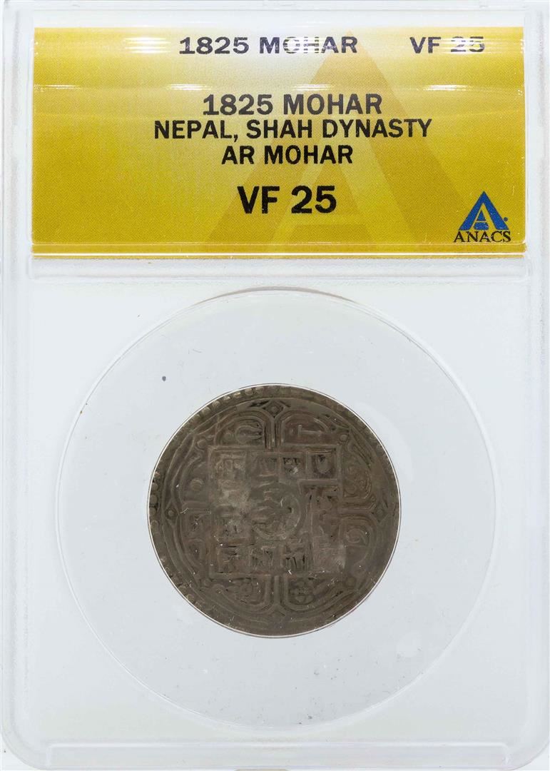 One 1825 Nepal Mohar Shah Dynasty Coin ANACS VF25. ANACS Certified.
