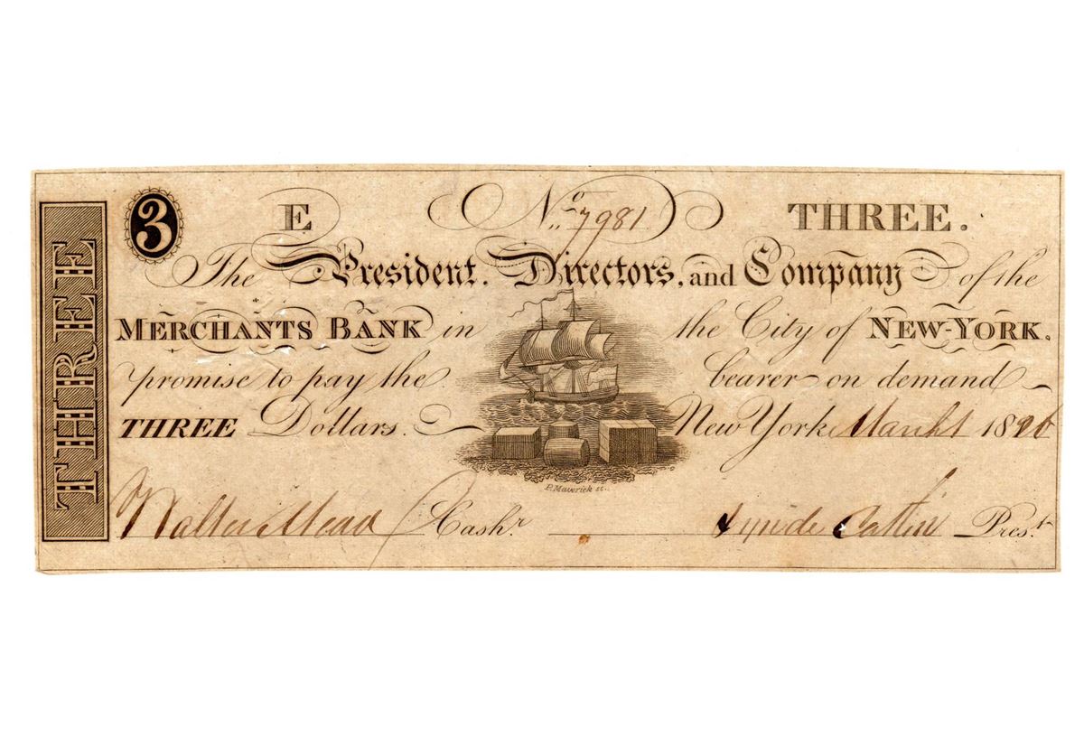 One 1826 $3 Merchants Bank in the City of New York, NY Bank Note.