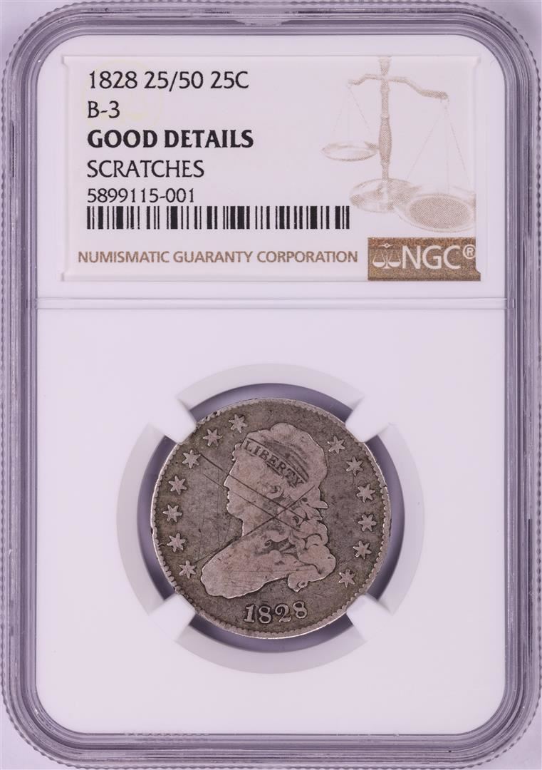 One 1828 25/50 Capped Buster Quarter Coin NGC Good Details B-3. NGC Certified.