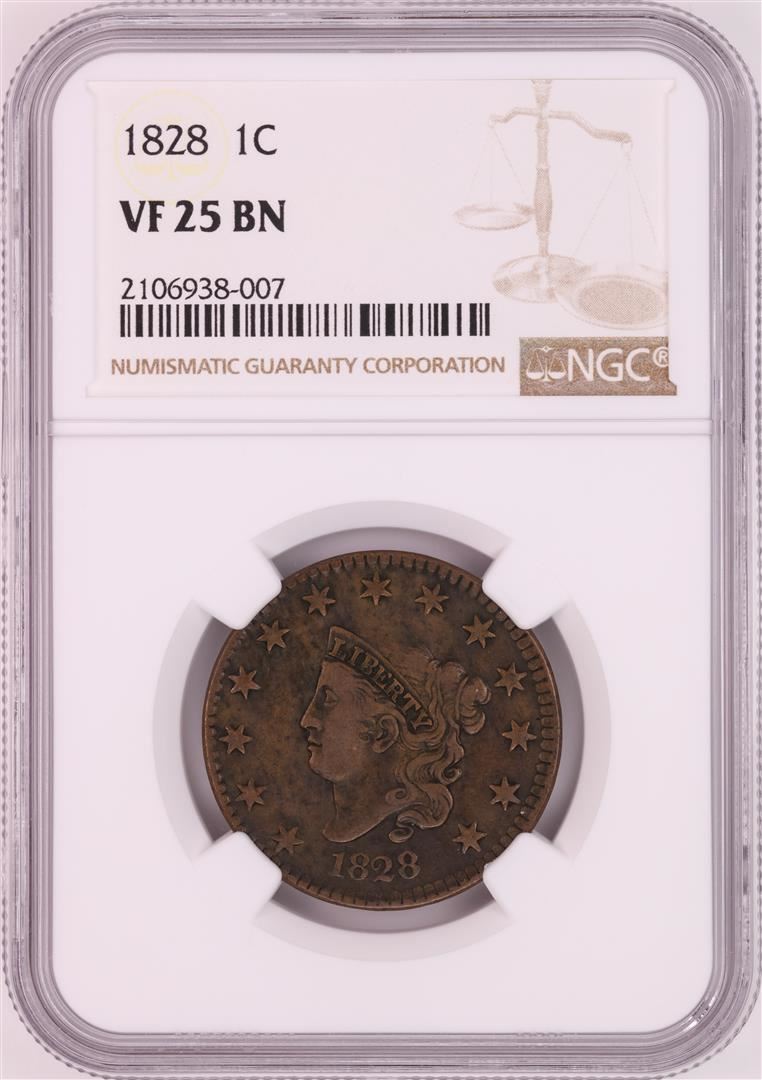 One 1828 Coronet Head Large Cent Coin NGC VF25BN. NGC Certified.