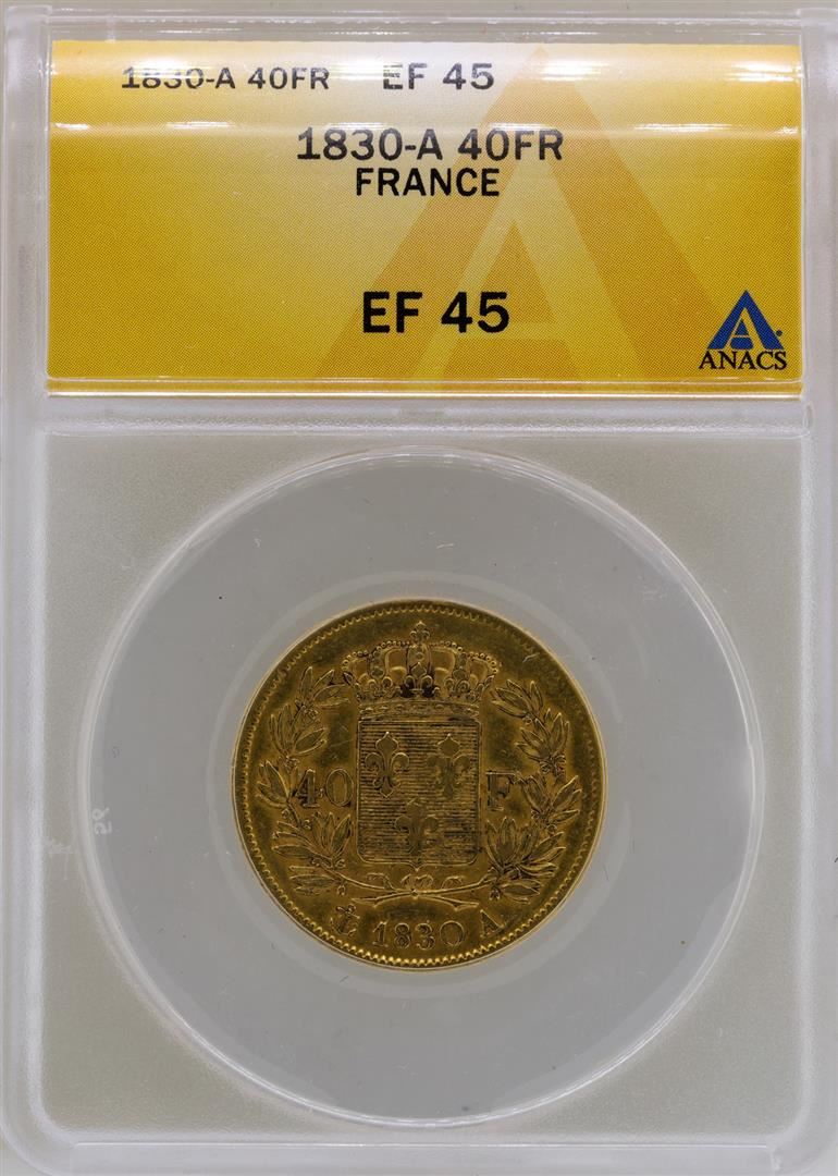 One 1830-A France 40 Francs Gold Coin ANACS XF45. ANACS Certified.