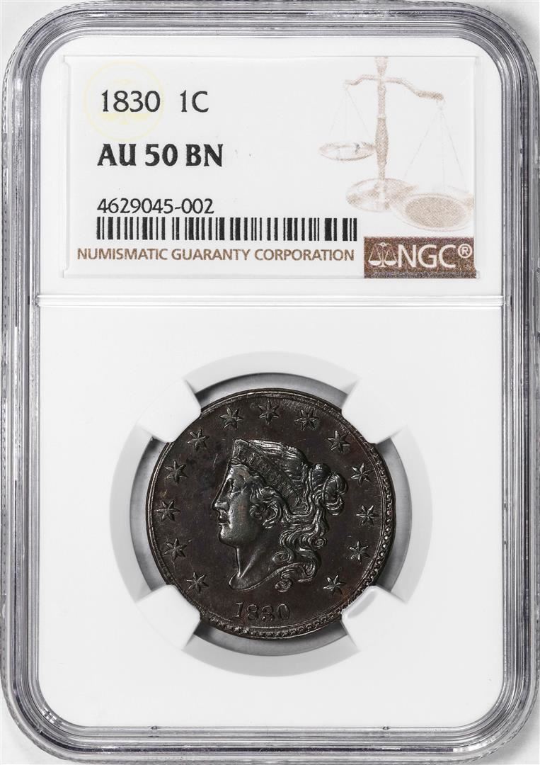 One 1830 Coronet Head Large Cent Coin NGC AU50BN. NGC Certified.