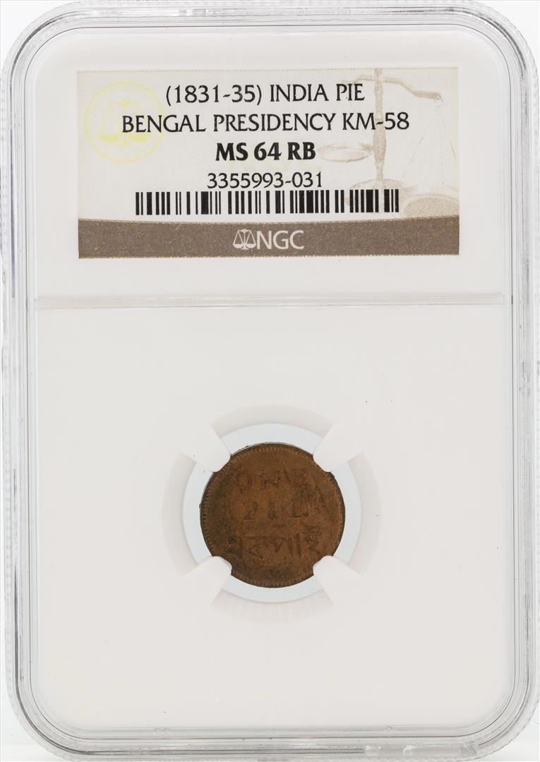 One 1831-35 India Pie Bangal Presidency KM-58 NGC MS64RB. NGC Certified.