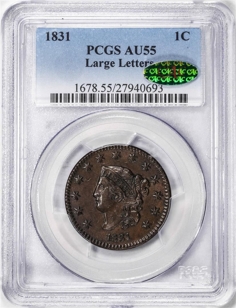 One 1831 Large Letters Coronet Head Large Cent Coin NGC AU55 CAC. NGC Certified.