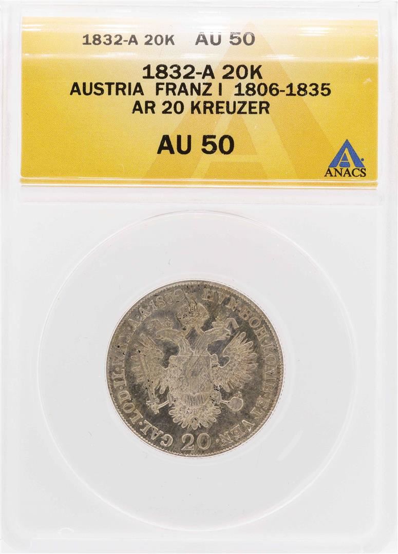 One 1832-A Austria Franz I AR 20 Kreuzer Coin ANACS AU50. ANACS Certified.