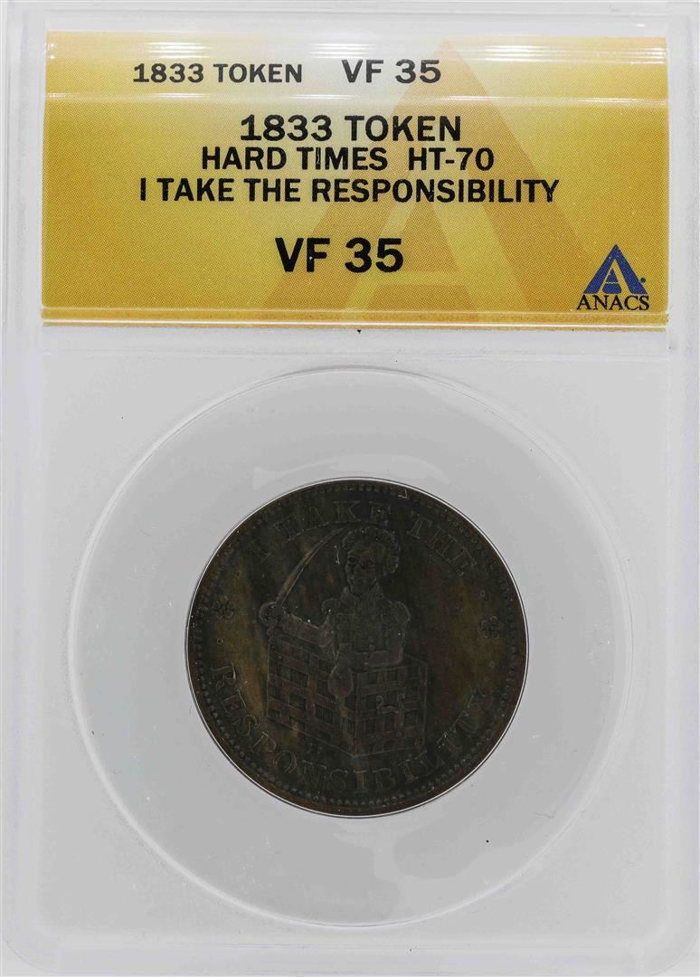 One 1833 Andrew Jackson Hard Times Token ANACS VF35. ANACS Certified.