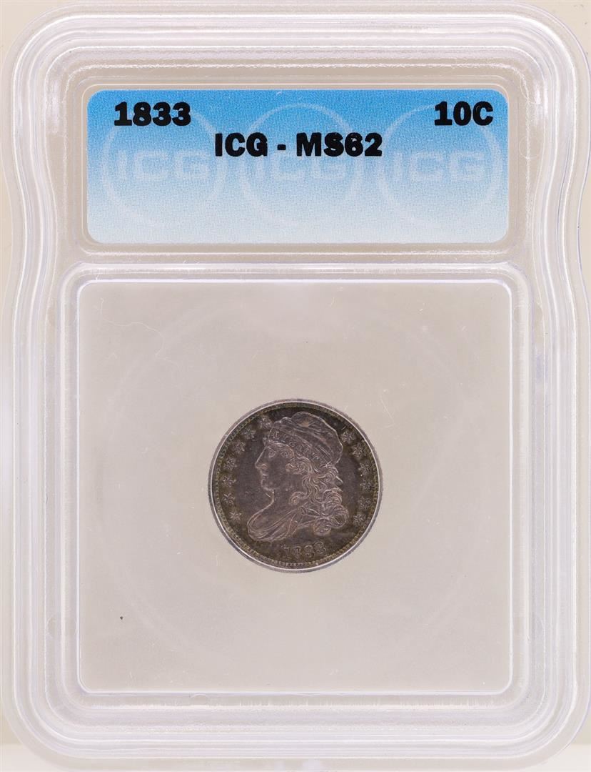 One 1833 Capped Bust Dime Coin ICG MS62. ICG Certified.