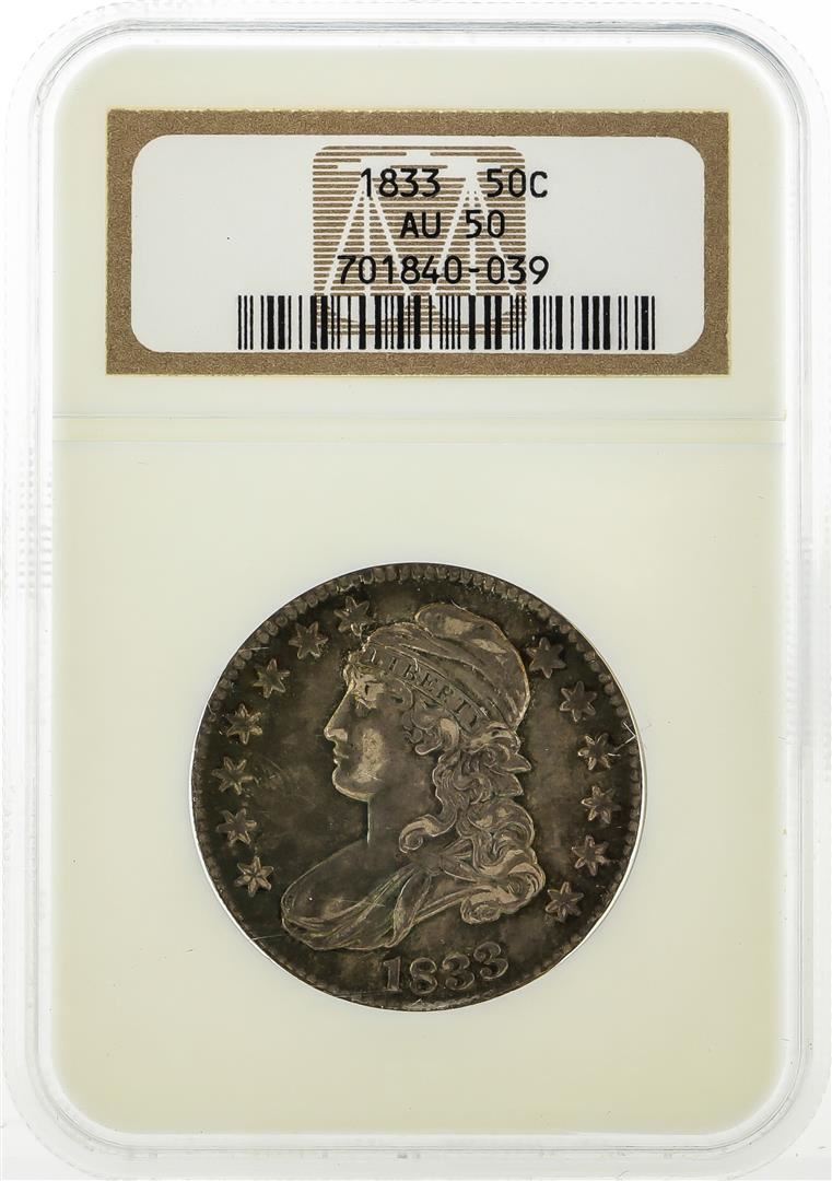 One 1833 Capped Bust Half Dollar Silver Coin NGC AU50. NGC Certified.