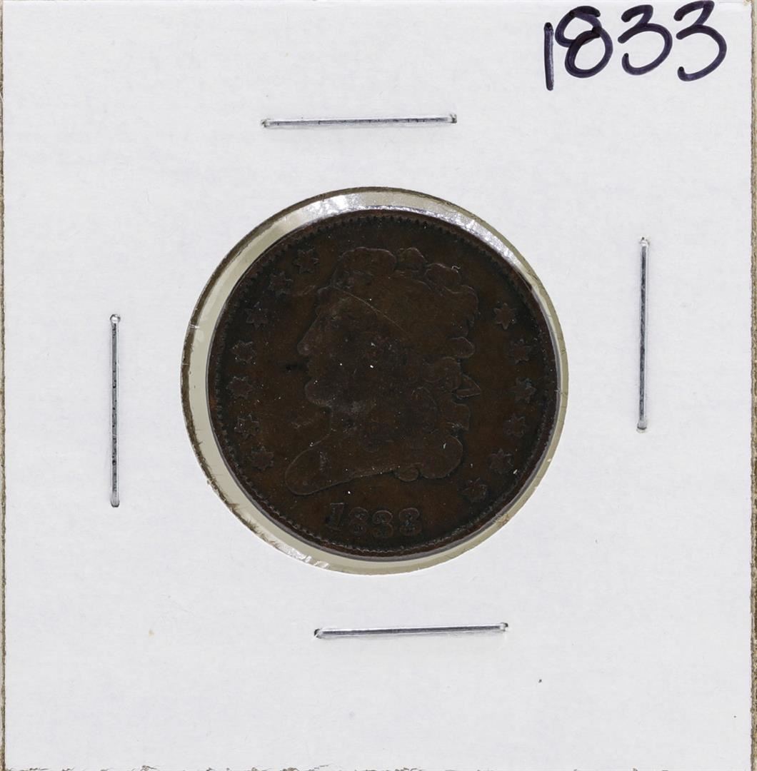 One 1833 Draped Bust Half Cent Coin.