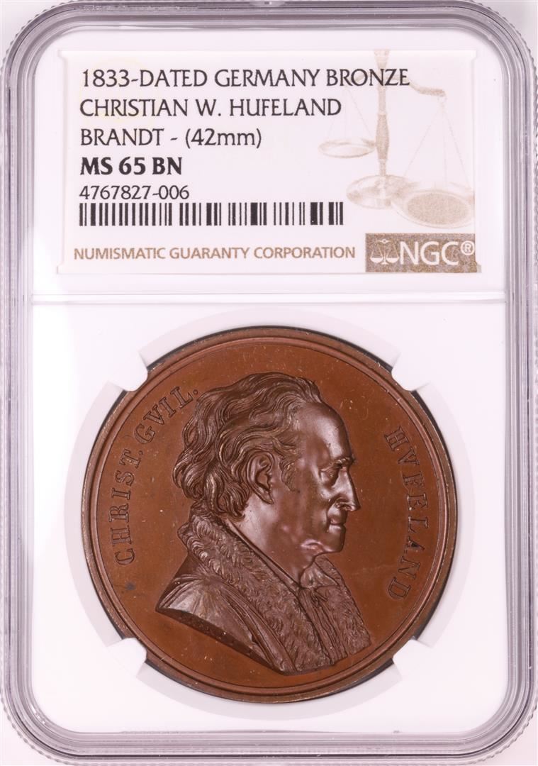 One 1833 Germany Bronze Christian W. Hufeland Brandt 42mm Medal NGC MS65BN. NGC Certified.